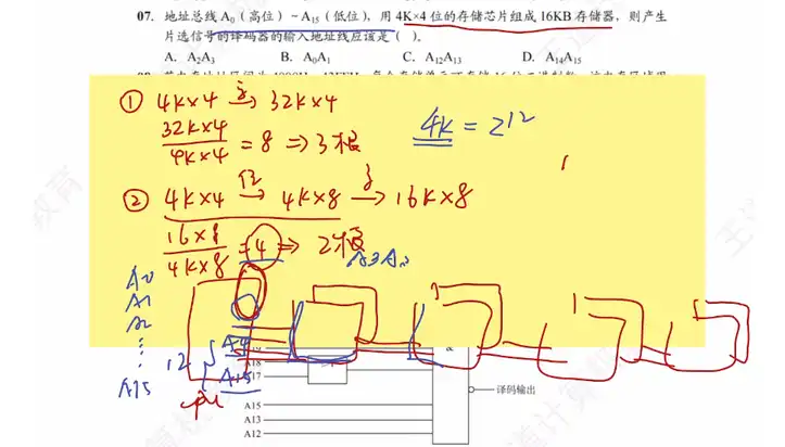 Q:地址总线 (高位) (低位),用 位的存储芯片组成 存储器,则产生片选信号的译码器的输入地址线应该是 ( )