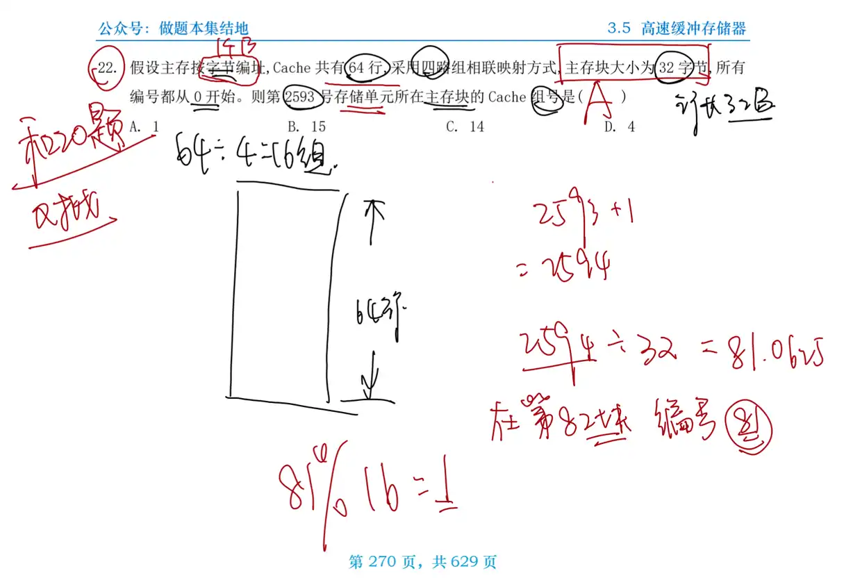 Q:假设主存按字节编址, Cache 共有 64 行, 采用四路组相联映射方式, 主存块大小为 32 字节, 所有编号都从 0 开始。则第 2593 号存储单元所在主存块的 Cache 组号是 ( )