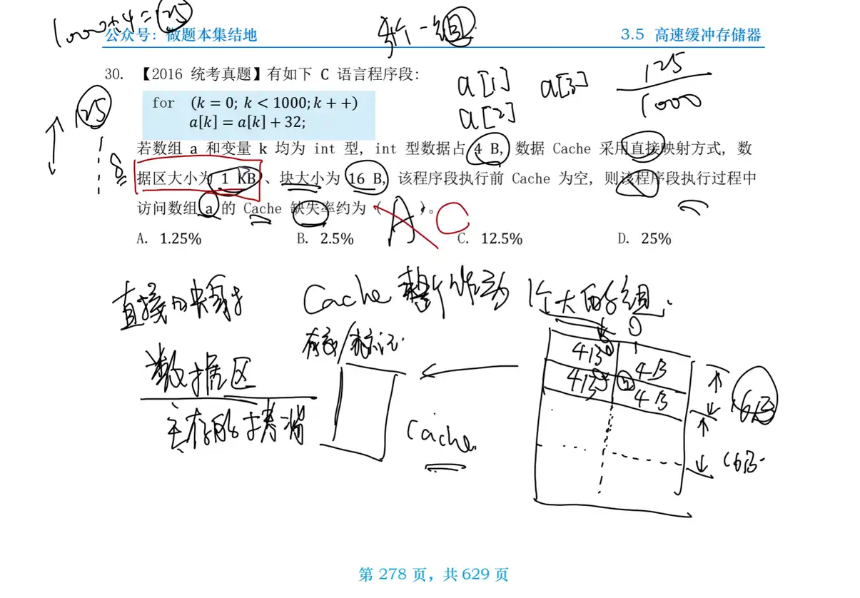 a[k] = a[k] + 32;若数组 a 以及变量 k 均为 int 型,int 型数据占 4B,数据 Cache 采用直接映射方式,数据区大小是 1KB,块大小是 16B,该程序段执行前 Cache 为空,则该程序段执行过程中,访问数组 a 的 Cache 的缺失率是( )。