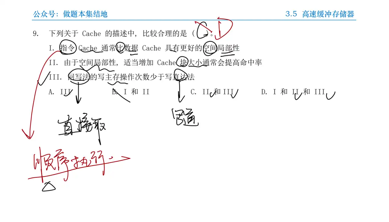 A:指令 Cache 通常比数据 Cache 具有更好的空间局部性, 这是因为指令流通常是顺序执行的, 而数据流跳转或随机访问的概率较高, I 正确。
