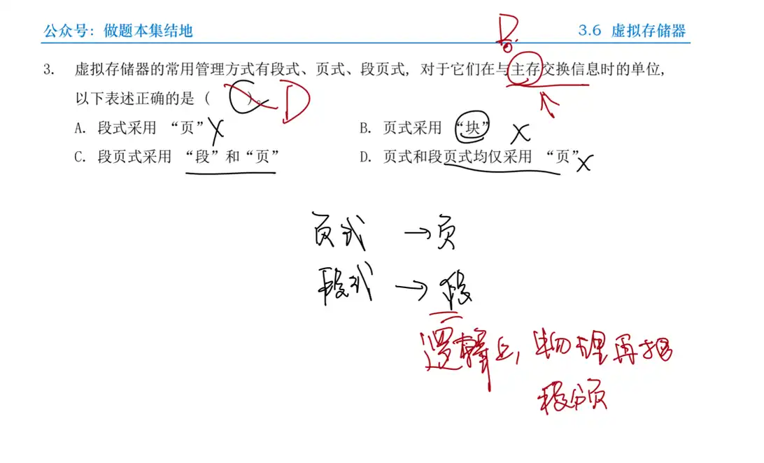 题3 题目 Q:虚拟存储器的常用管理方式有段式、页式、段页式, 对于它们在与主存交换信息时的单位,以下表述正确的是 ( )。 A. 段式采用 “页” B. 页式采用 “块” C. 段页式采用 “段” 和 “页” D. 页式和段页式均仅采用 “页” 分析 A:页式虚拟存储方式对程序分页, 采用页进行交互; 段页式则先按照逻辑分段, 然后分页, 以页为单位和主存交互, D 正确。 解 D