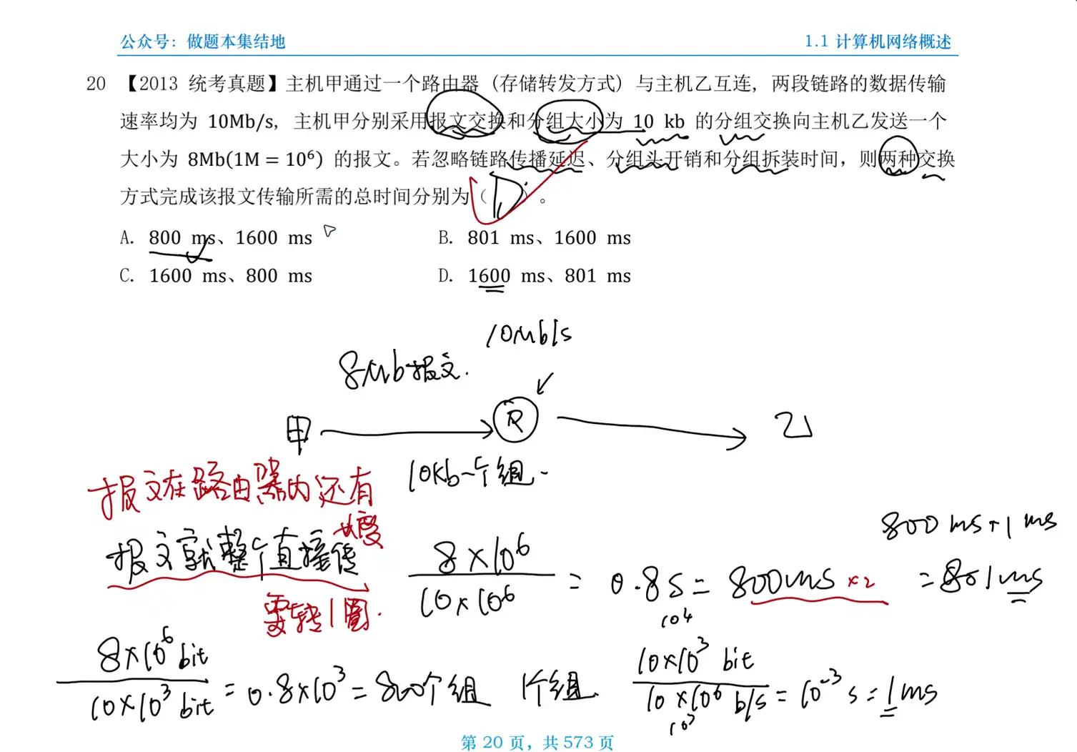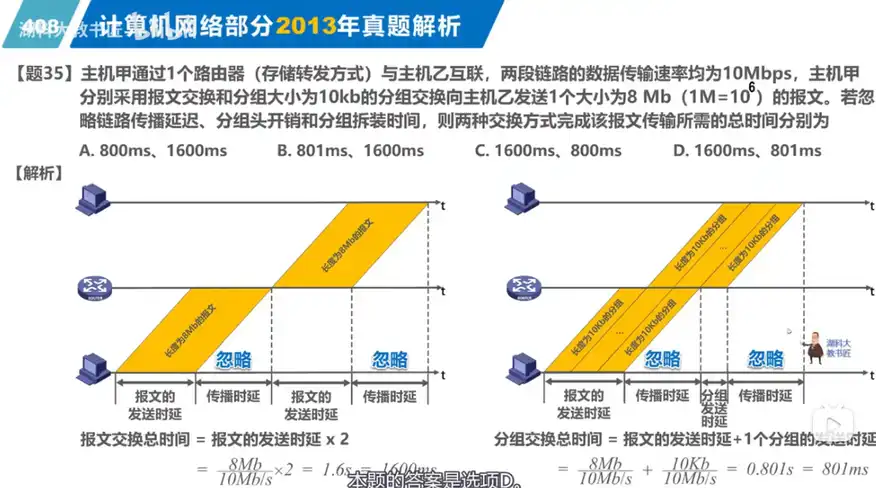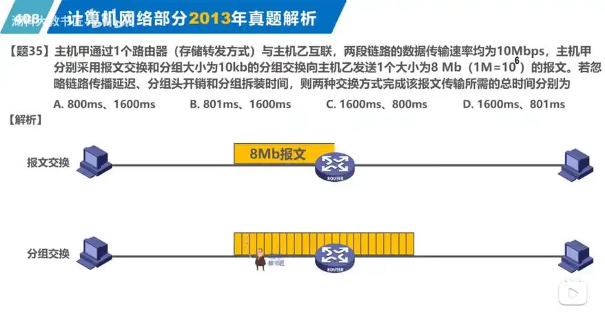 Q:【2013 统考真题】主机甲通过一个路由器(存储转发方式)与主机乙互连,两段链路的数据传输速率均为 ,主机甲分别采用报文交换和分组大小为 的分组交换向主机乙发送一个大小为 的报文。若忽略链路传播延迟、分组头开销和分组拆装时间, 则两种交换方式完成该报文传输所需的总时间分别为 ( ) 。