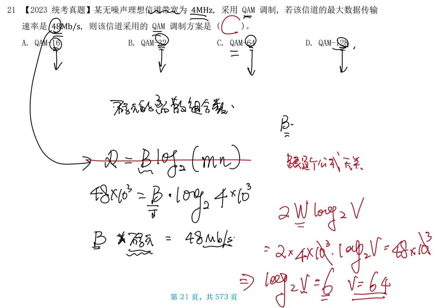 Q:【2023 统考真题】某无噪声理想信道带宽为 ,采用 QAM 调制,若该信道的最大数据传输速率是 ,则该信道采用的 QAM 调制方案是 ( )。