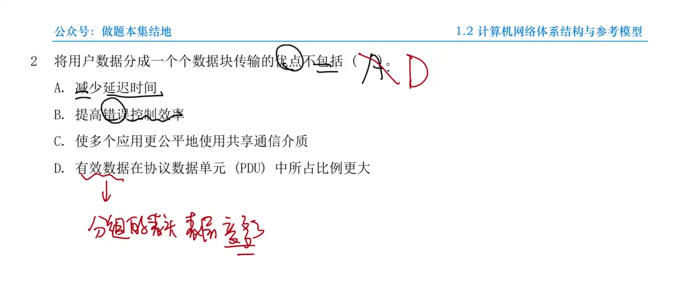 题2 题目 Q:将用户数据分成一个个数据块传输的优点不包括 ( ) 。 A. 减少延迟时间 B. 提高错误控制效率 C. 使多个应用更公平地使用共享通信介质 D. 有效数据在协议数据单元 (PDU) 中所占比例更大 分析 A:将用户数据分成一个个数据块传输, 因为每块均需加入控制信息, 所以实际上会使有效数据在 PDU 中所占的比例更小。其他各项均为其优点。 解 选D