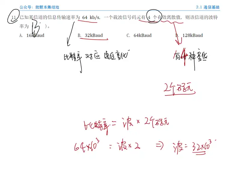 题11 题目 Q:已知某信道的信息传输速率为 ,一个载波信号码元有 4 个有效离散值,则该信道的波特率为( )。 A. 16kBaud B. C. D. 分析 A:一个码元若取 个不同的离散值,则含有 比特的信息量。本题中,一个码元所含的信息量为 2 比特,因为数值上波特率 比特率/每码元所含比特数,所以波特率为 aud。 解 选B