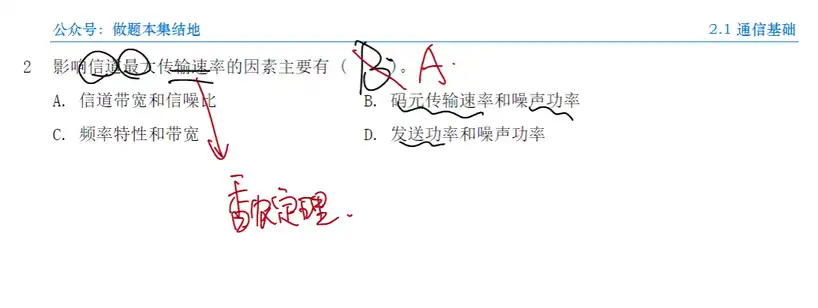 题2 题目 Q:影响信道最大传输速率的因素主要有 ( )。 A. 信道带宽和信噪比 B. 码元传输速率和噪声功率 C. 频率特性和带宽 D. 发送功率和噪声功率 分析 A:根据香农定理, 影响信道最大传输速率的因素主要有信道带宽和信噪比, 而信噪比与信道内所传输的平均信号功率和噪声功率有关, 数值上等于二者之比。 解 选A