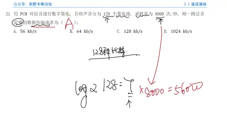 题21 题目 Q:用 PCM 对语音进行数字量化, 若将声音分为 128 个量化级, 采样率为 8000 次/秒, 则一路话音需要的数据传输速率为 ( ) 。 A. B. C. D. 分析 A:声音信号需要 128 个量化级,因此每采样一次就需要 比特来表示,每秒采样 8000 次,一路话音需要的数据传输速率为 。 解 选A
