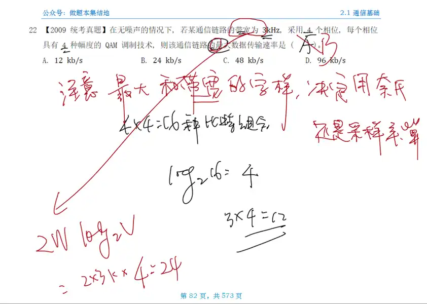 题22 题目 Q:【2009 统考真题】在无噪声的情况下,若某通信链路的带宽为 ,采用 4 个相位,每个相位具有 4 种幅度的 QAM 调制技术,则该通信链路的最大数据传输速率是 ( ) A. B. C. D. 分析 A:采用 4 个相位, 每个相位有 4 种幅度的 QAM 调制方法, 每个信号有 16 种变化, 传输 4 比特的数据。根据奈奎斯特定理,信息的最大传输速率为 。 解 选B
