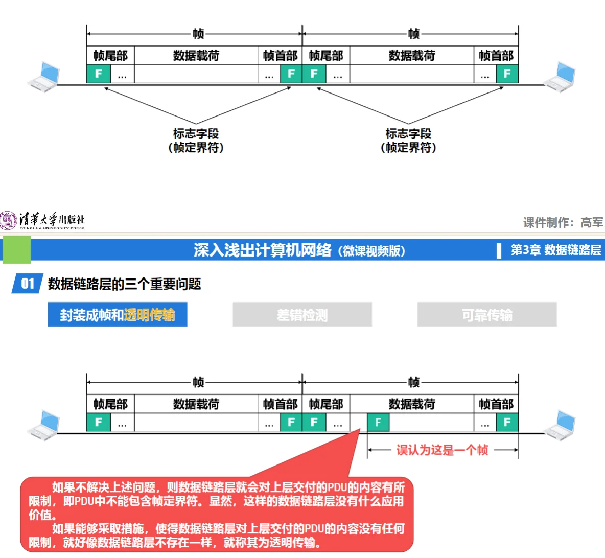 - 组帧: 将网络层数据报封装成帧,添加首部和尾部。