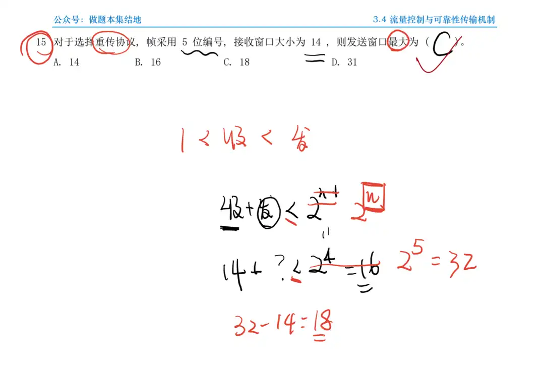 题15 题目 Q:对于选择重传协议,帧采用 5 位编号,接收窗口大小为 14 ,则发送窗口最大为 ( )。 A. 14 B. 16 C. 18 D. 31 分析 A:在选择重传协议中,若用 比特对帧编号,则发送窗口和接收窗口的大小关系为 ,此外还需满足 ,所以发送窗口的最大尺寸为 。 解 选C