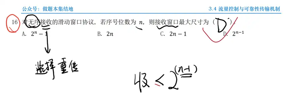 题16 题目 Q:对无序接收的滑动窗口协议,若序号位数为 ,则接收窗口最大尺寸为 ( )。 A. B. C. D. 分析 A:注意,无序接收的滑动窗口这个条件 本题未直接告知使用的是选择重传协议, 而是通过间接方式给出的。题目说无序接收的滑动窗口协议,表示接收窗口大于 1,所以使用的是选择重传协议,接收窗口最大尺寸为 。 解 选D