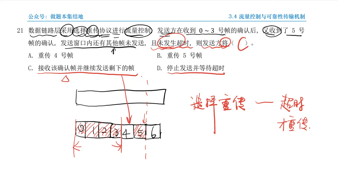 题21 题目 Q:数据链路层采用选择重传协议进行流量控制,发送方在收到 号帧的确认后,又收到了 5 号帧的确认,发送窗口内还有其他帧未发送,且未发生超时,则发送方将()。 A. 重传 4 号帧 B. 重传 5 号帧 C. 接收该确认帧并继续发送剩下的帧 D. 停止发送并等待超时 分析 A: 选择重传协议SR,超时才重传 解 选C