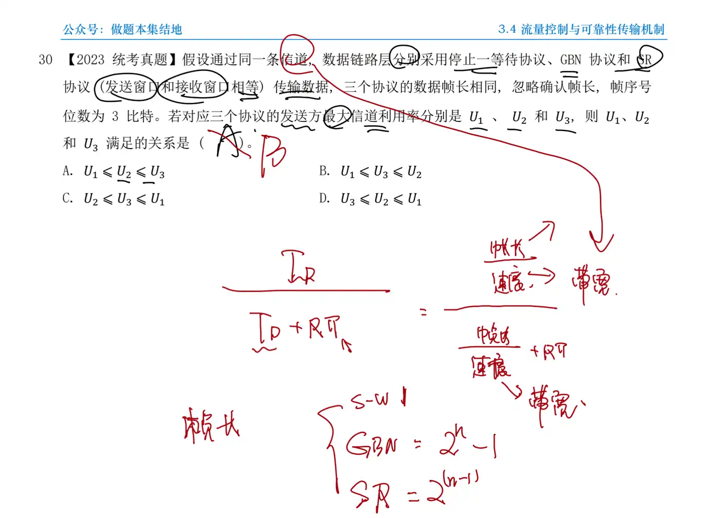 Q:【2023 统考真题】假设通过同一条信道, 数据链路层分别采用停止一等待协议、GBN 协议和 SR 协议(发送窗口和接收窗口相等)传输数据,三个协议的数据帧长相同,忽略确认帧长,帧序号位数为 3 比特。若对应三个协议的发送方最大信道利用率分别是 ,则 满足的关系是 ( )。