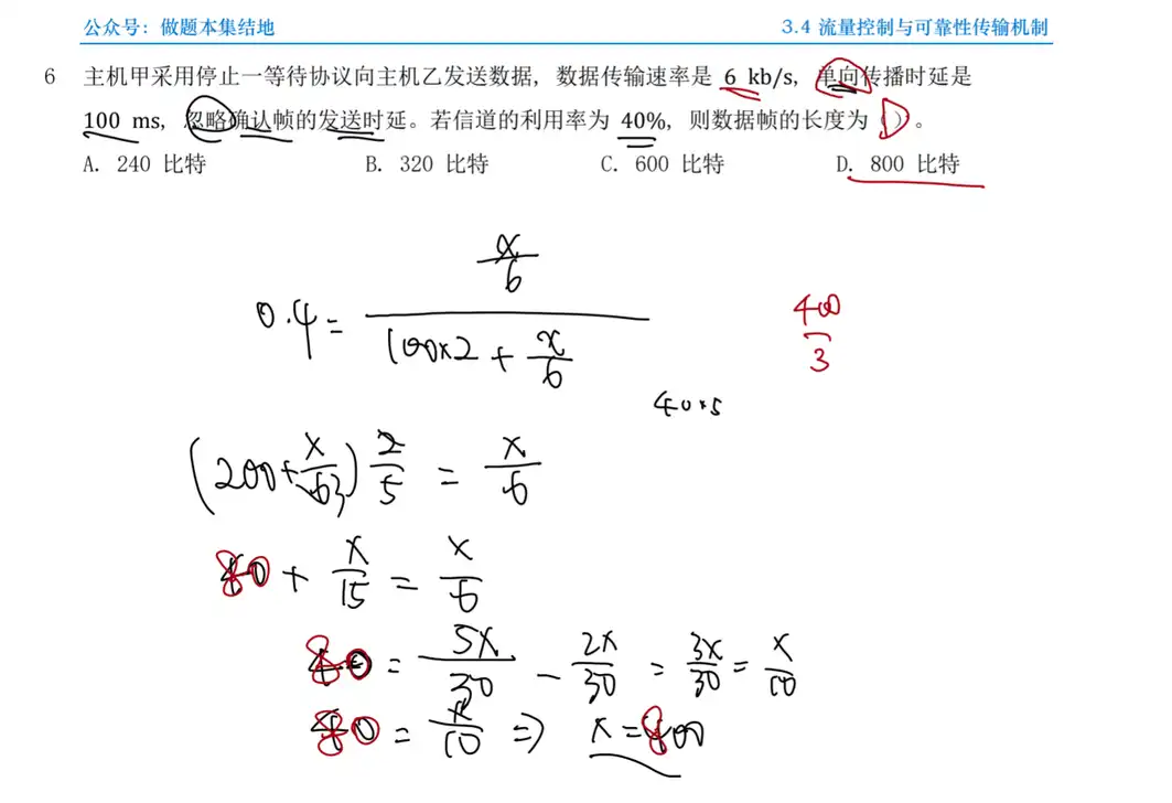 题6 题目 Q:主机甲采用停止一等待协议向主机乙发送数据, 数据传输速率是 ,单向传播时延是 ,忽略确认帧的发送时延。若信道的利用率为 ,则数据帧的长度为()。 A. 240 比特 B. 320 比特 C. 600 比特 D. 800 比特 分析 A: 解 选D 本题忽略确认帧的发送时延,所以信道利用率 =数据帧的发送时延数据帧的发送时延 + 往返时延)=0.4,解得数据帧的发送时延为 4/30s,所以数据帧的长度为6kb/s×4/30s=800bit。