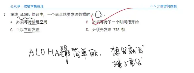 题7 题目 Q:在纯 ALOHA 协议中,一个站点想要发送数据时( )。 A. 必须等待信道空闲 B. 必须等待下一个时间槽开始 C. 可以立即发送 D. 必须先发送 RTS 帧 分析 A:在纯 ALOHA 协议中, 一个站点想要发送数据时可以立即发送, 而不需要等待信道空闲或下一个时间槽开始, 也不需要先发送 RTS 帧。 解 选C