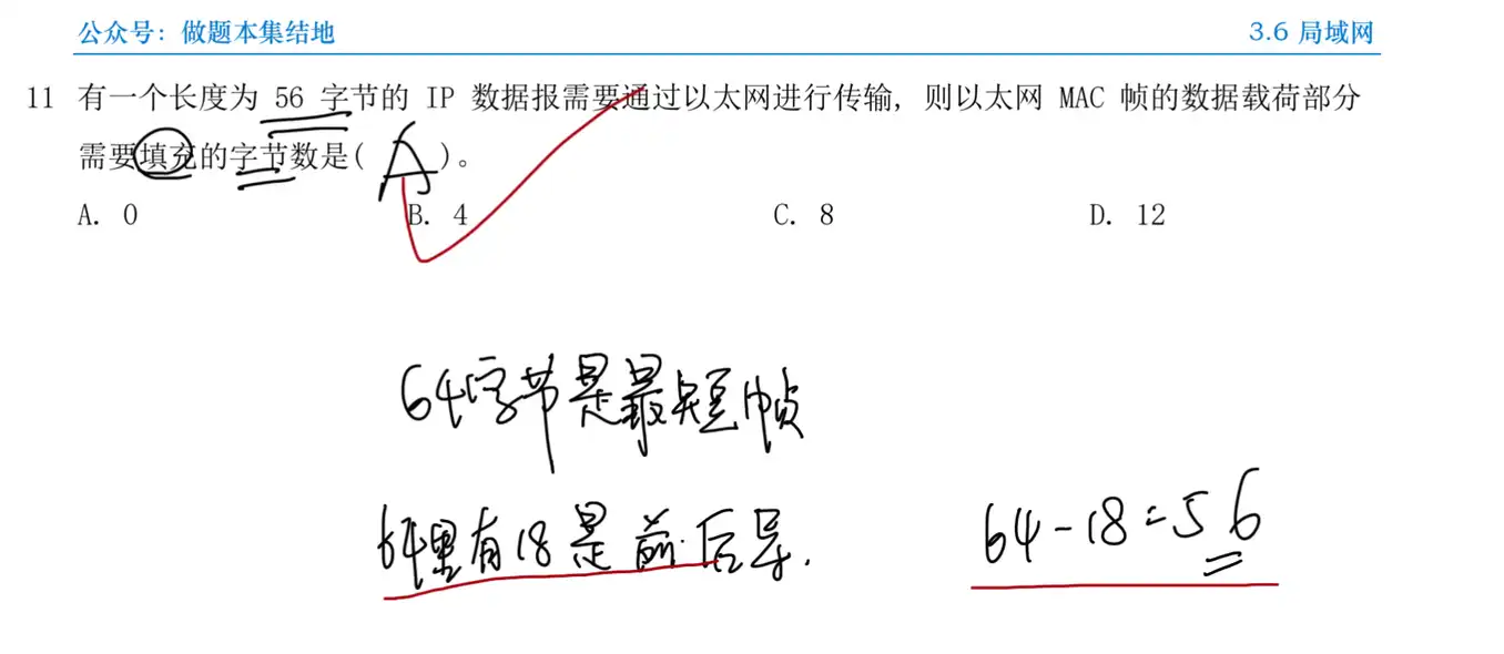 题11 题目 Q:有一个长度为 56 字节的 IP 数据报需要通过以太网进行传输, 则以太网 MAC 帧的数据载荷部分需要填充的字节数是 ( )。 A. 0 B. 4 C. 8 D. 12 分析 A:以太网 MAC 帧的数据载荷部分的长度必须在 46 字节和 1500 字节之间, 若小于 46 字节, 则需要填充字节来达到最小长度。IP 数据报的长度为 56 字节, 因此不需要填充字节。 解 选A