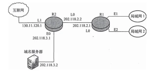 【2009 统考真题】某网络拓扑如下图所示,路由器 R1 通过接口 E1、E2 分别连接局域网 1、局域网 2,通过接口 L0 连接路由器 R2,并通过路由器 R2 连接域名服务器与互联网。R1 的 L0 接口的 IP 地址是 202.118.2.1;R2 的 L0 接口的 IP 地址是 202.118.2.2,L1 接口的 IP 地址是 130.11.120.1,E0 接口的 IP 地址是 202.118.3.1;域名服务器的 IP 地址是 202.118.3.2。