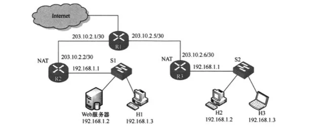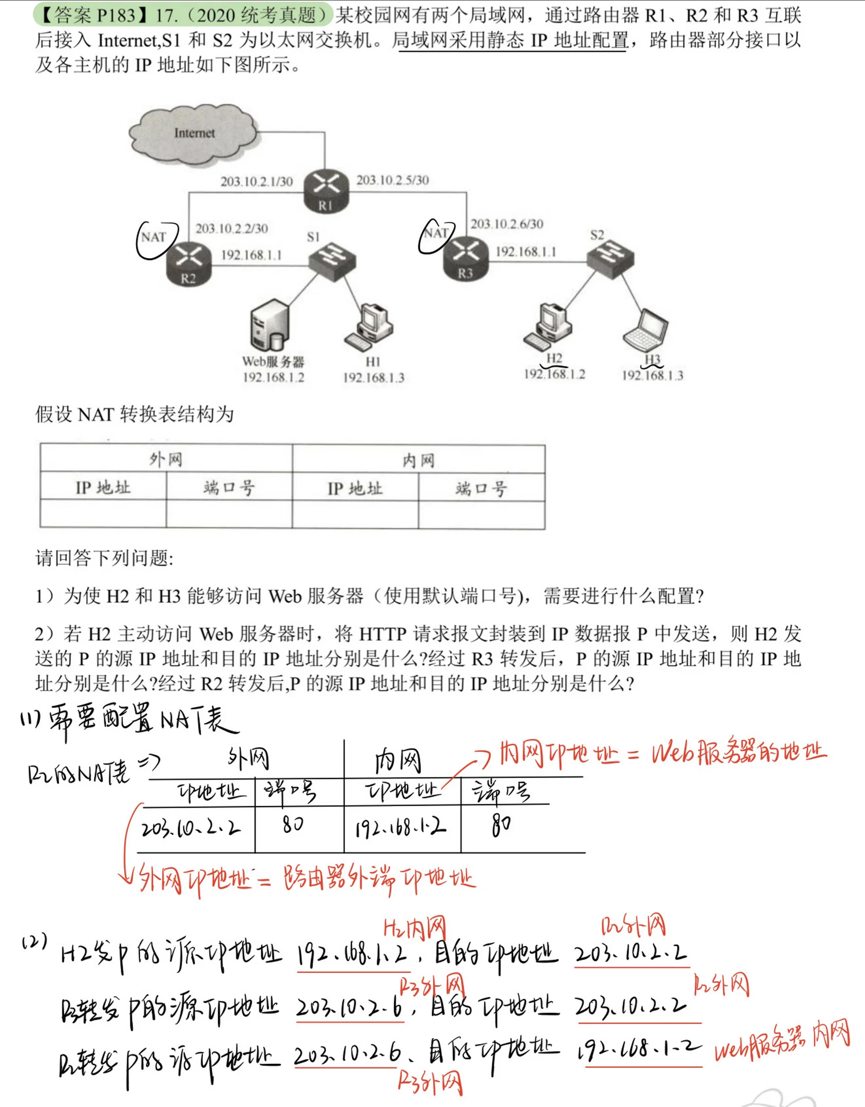 1. 与 Web 服务器处于不同的局域网,路由器 R2、R3 具有 NAT 功能。当 R2 从 WAN 口收到来自 H2 或 H3 发来的 HTTP 请求时, 根据 NAT 表发送给 Web 服务器的对应端口。为使外部主机能正常访问 Web 服务器, 应在 R2 的 NAT 表中增加一项, 外网的 IP 地址配置为路由器的外端 IP 地址, 内网的 IP 地址配置为 Web 服务器的 IP 地址, HTTP 的服务器端的默认端口号为 80 , 因此外网和内网的端口号都需配置为 80 。只需在 R2 中配置 Web 服务器的 NAT 表项, 而不用在 R3 中配置 H2 和 H3 的 NAT 表项, 原因在于我们只知道 Web 服务器的端口号 80, 而客户端的端口号是随机分配的, 无法做静态配置, 只能通过自动动态配置实现。R2 的 NAT 表配置如下: