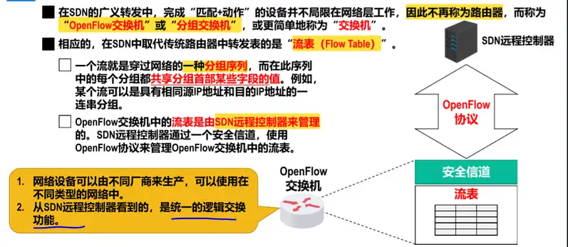 A: SDN 中的路由器不再需要路由选择软件,路由器之间不再相互交换路由信息,转发表由远程控制器集中管理和下发。