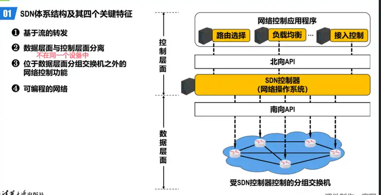 2.数据平面与控制平面分离。数据平面由网络交换机组成,交换机是相对简单(但快速)的设备,该设备在它们的流表中执行 “匹配加动作” 的规则。控制平面由服务器以及决定和管理交换机流表的软件组成部分