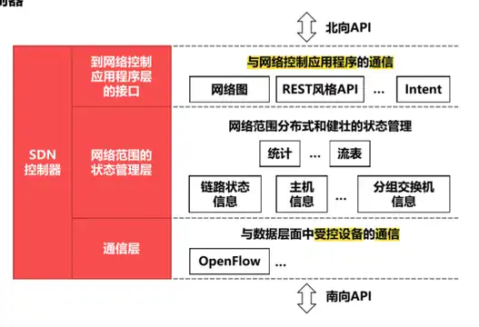 A: 北向接口是 SDN 提供给上层应用开发者的编程接口,提供了一系列丰富的 API,开发者可以在此基础上设计自己的应用,而不必关心底层的硬件细节。