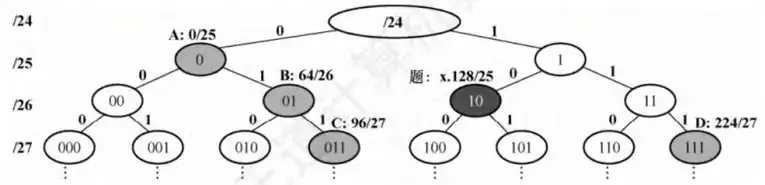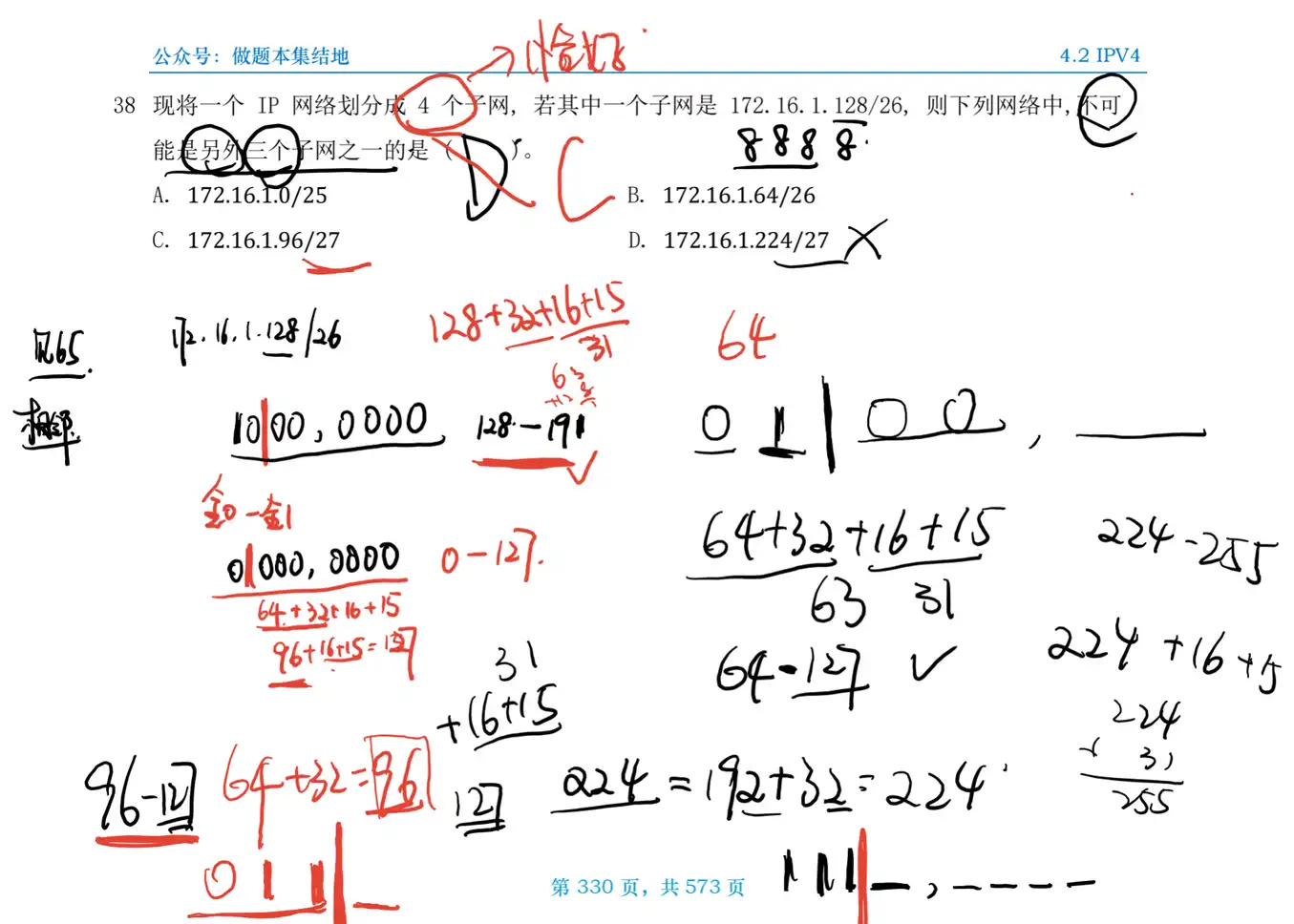 题38 题目 Q:现将一个 IP 网络划分成 4 个子网, 若其中一个子网是 172.16.1.128/26, 则下列网络中, 不可能是另外三个子网之一的是 ( )。 A. B. C. D. 172.16.1.224/27 分析 A: 解 选C