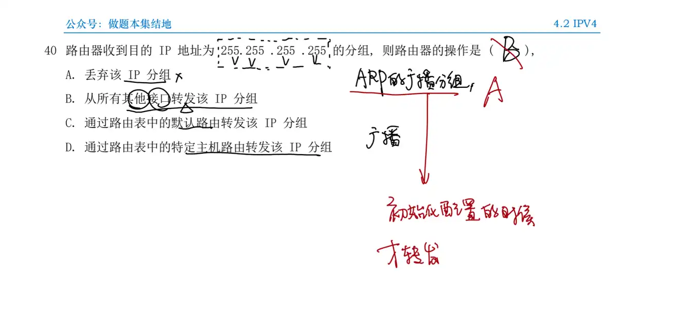 Q:路由器收到目的 IP 地址为 255.255 .255 .255 的分组, 则路由器的操作是 ( )