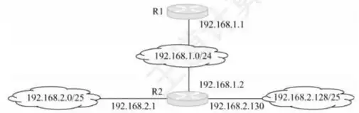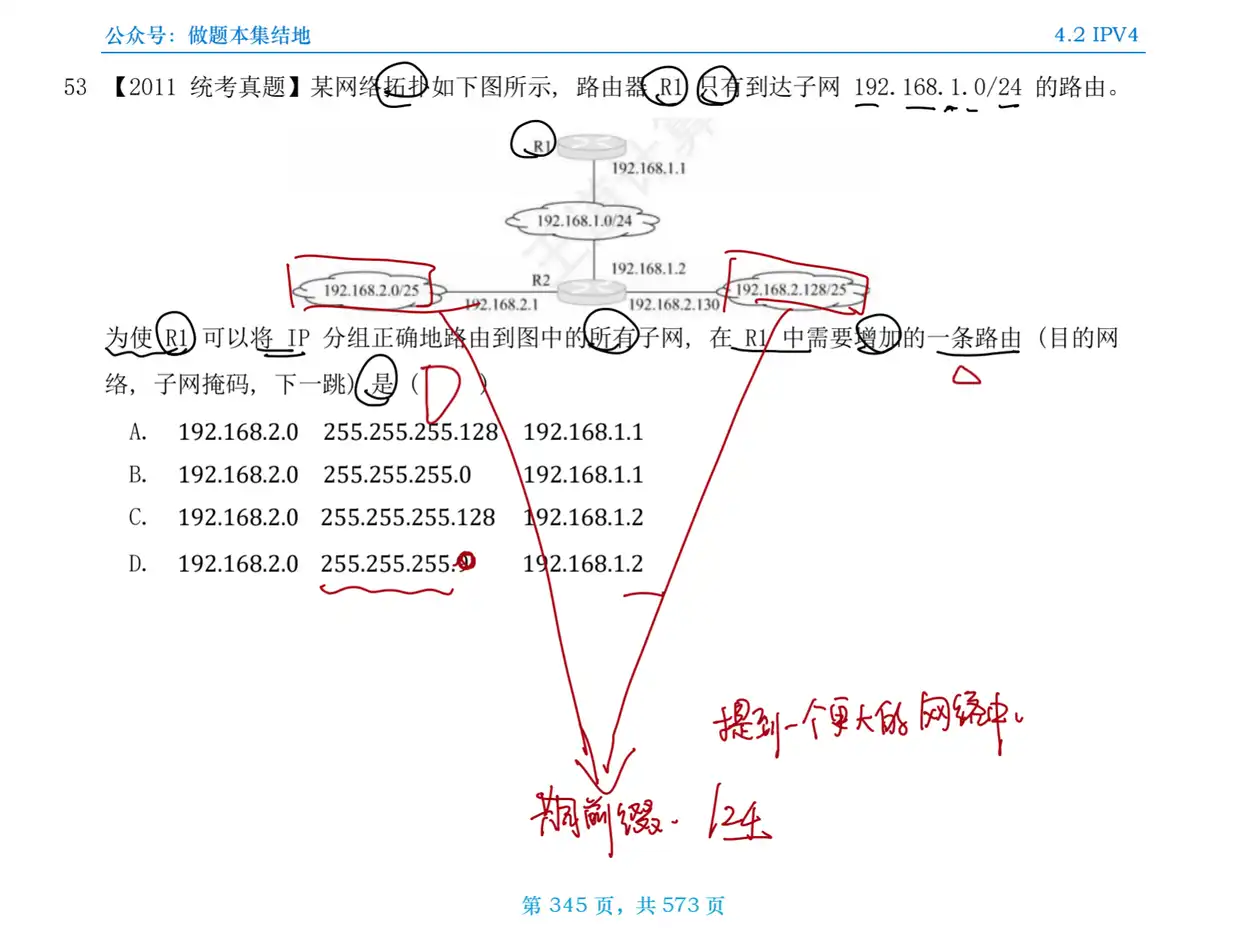 Q:【2011 统考真题】某网络拓扑如下图所示,路由器 R1 只有到达子网 192.168.1.0/24 的路由。为使 R1 可以将 IP 分组正确地路由到图中所有子网,则在 R1 中需要增加的一条路由(目的网络,子网掩码,下一跳)是( )。