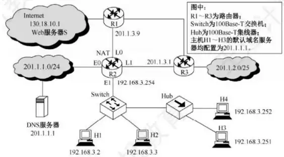 要实现正常的跨网络通信, 就必须通过路由器, 于是配置的默认网关应是 R2 的 E1 接口的 IP 地址 192.168.3.254, 由 R2 来实现跨网络的分组的转发, 而 H2 的默认网关为 192.168.3.1, 所以 H2 不能访问 Internet H4 的默认网关为 192.168.3.254, 所以 H4 可以正常访问 Internet。