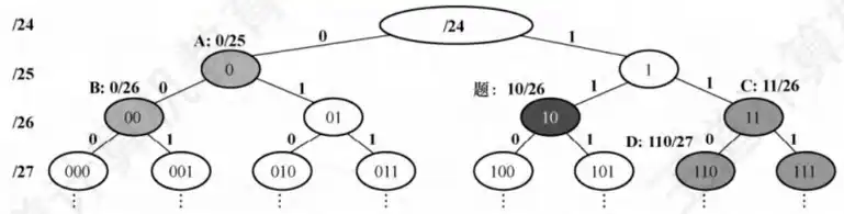 划分子网的原则是要求划分出来的子网的 IP 地址空间互不重叠, 且原来的 IP 地址空间不遗漏, 求解本题最好的方法是代入选项, 观察是否可将原 IP 地址空间分割为 3 个互不重叠的子网。根据题意,将 IP 网络划分为 3 个子网。其中一个是 192.168.9.128/26。可简写成 10/26(省略前面相同的 24 位前缀,其中 10 是 128 的二进制 10000000 的前两位,因为 )。同理,选项 A 可简写成 0/25;选项 B 可简写成 00/26;选项 C 可简写成 11/26;选项 D 可以简写成 110/27。采用二叉树形式画出这些子网的地址空间如下图所示。