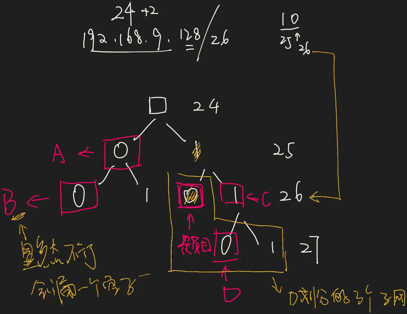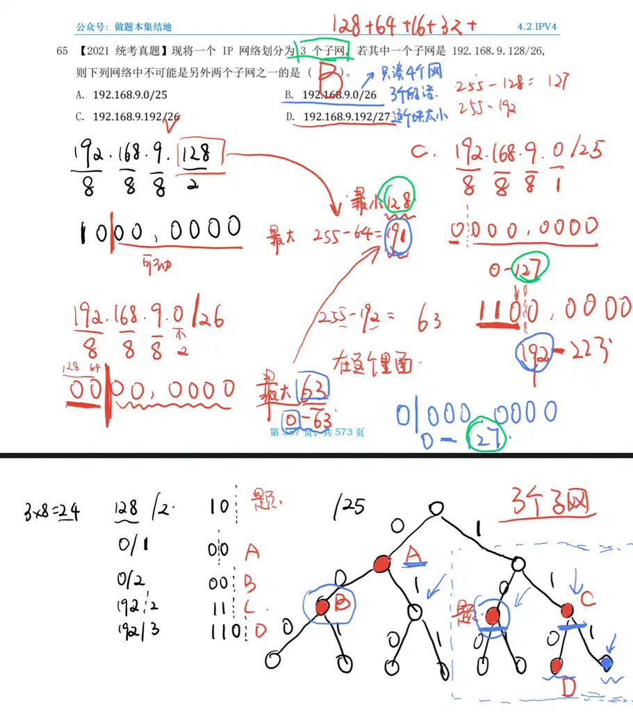 Q:【2021 统考真题】现将一个 IP 网络划分为 3 个子网, 若其中一个子网是192.168.9.128/26, 则下列网络中不可能是另外两个子网之一的是 ( )。