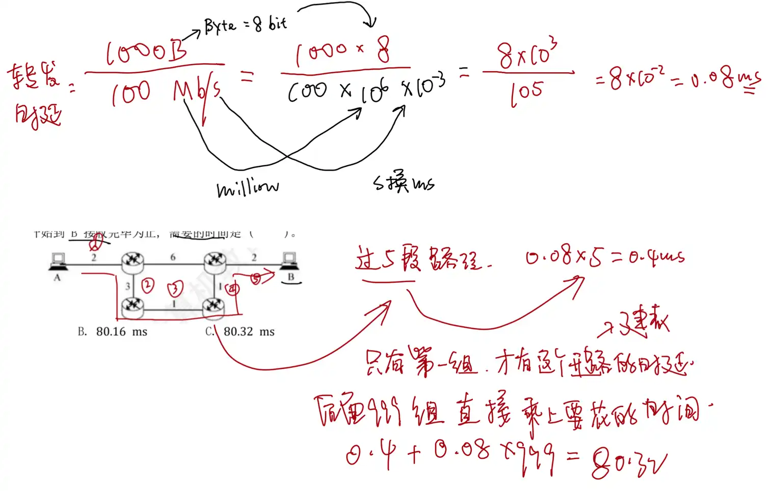A:根据 OSPF 算法, 从 A 到 B 转发经过的链路代价依次为 ,一共经过 4 个路由器。分组长度为 ,首部长度为 ,数据长度为 ,所以共有 个分组,每次存储转发时延为 ,第一个分组从 的时间为 , 剩下的 999 个分组每经过 就到达一个,所以总时间为