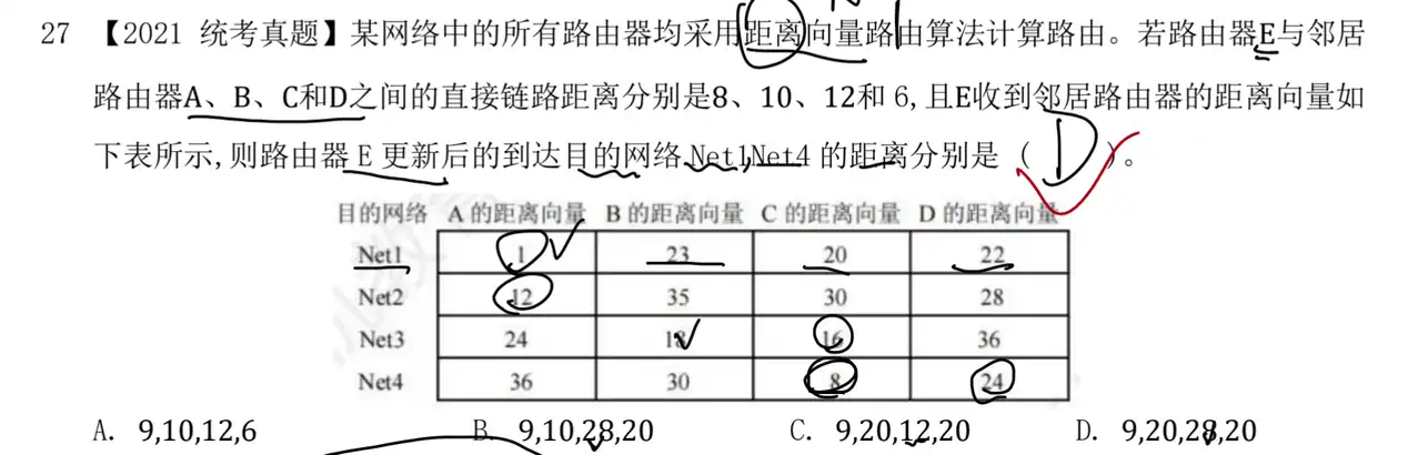 【2021 统考真题】某网络中的所有路由器均采用距离向量路由算法计算路由。若路由器 E 与邻居路由器 A、B、C 和 D 之间的直接链路距离分别是 8、10、12 和 6,且 E 收到邻居路由器的距离向量如下表所示,则路由器 E 更新后的到达目的网络 Net1~Net4 的距离分别是( )。