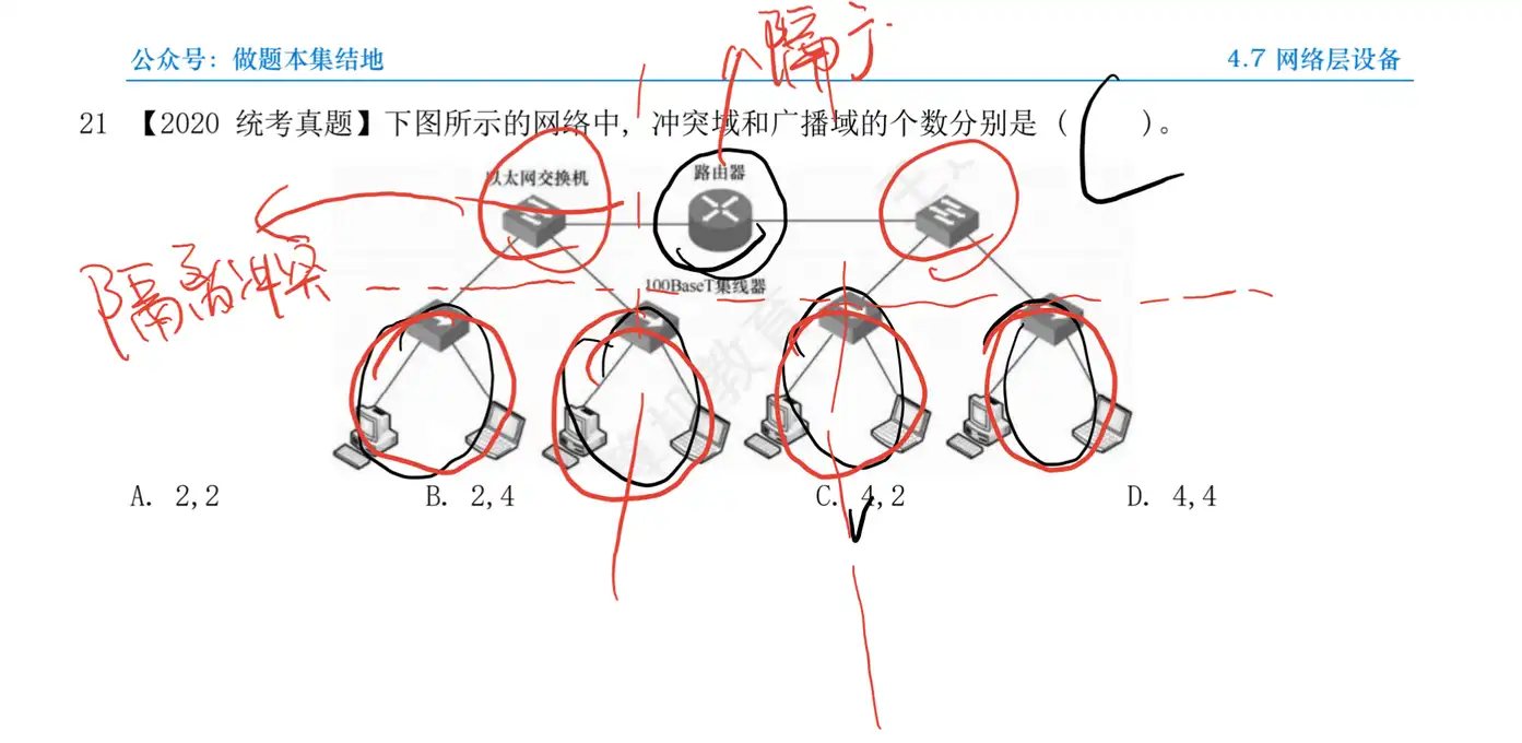 Q:【2020 统考真题】下图所示的网络中,冲突域和广播域的个数分别是 ( )。