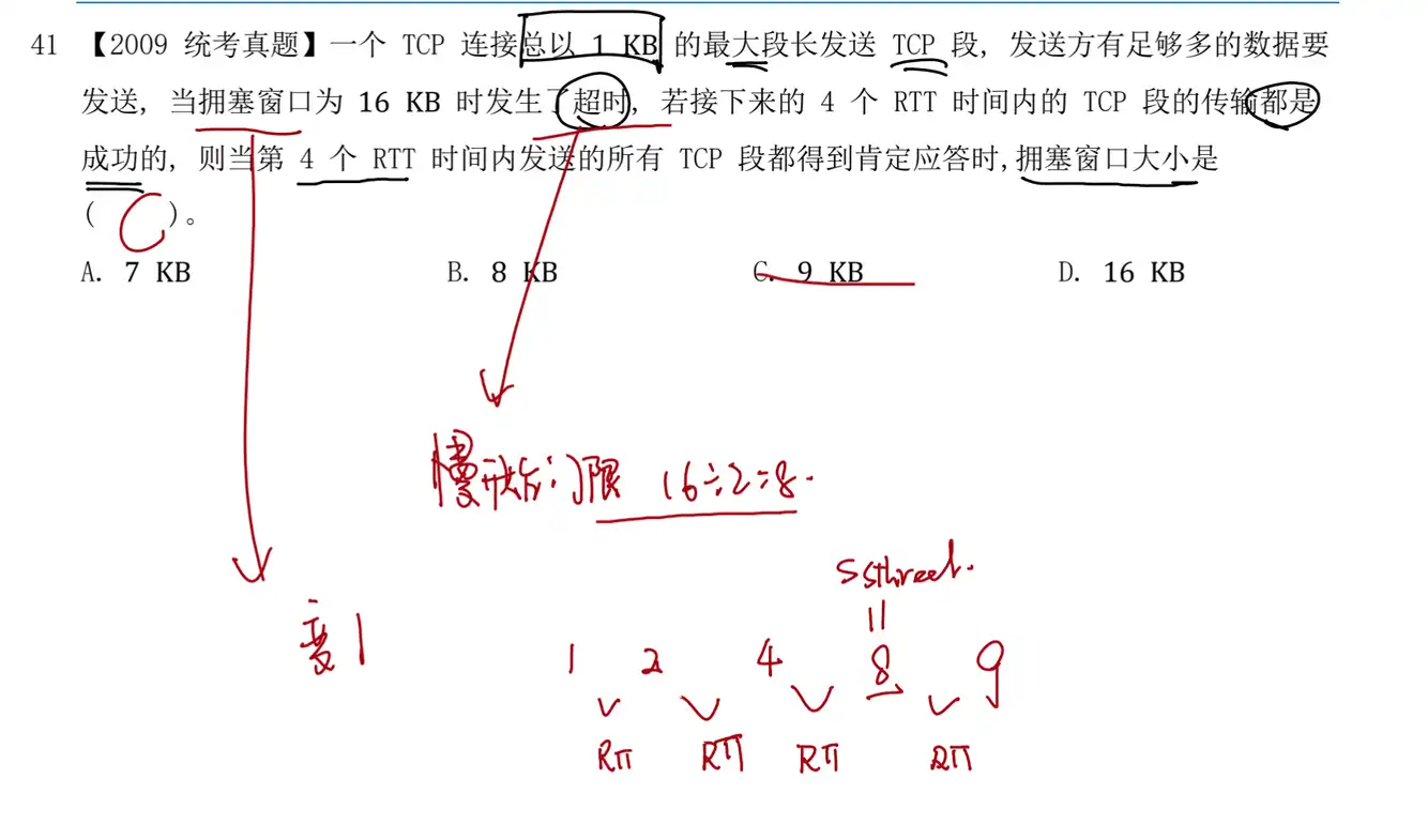 题41 题目 Q:【2009 统考真题】一个 TCP 连接总以 的最大段长发送 TCP 段,发送方有足够多的数据要发送, 当拥塞窗口为 时发生了超时, 若接下来的 4 个 RTT 时间内的 TCP 段的传输都是成功的, 则当第 4 个 RTT 时间内发送的所有 TCP 段都得到肯定应答时, 拥塞窗口大小是 ( )。 A. B. C. D. 分析 A:超时触发拥塞避免,门限减半,拥塞窗口归为初始值,然后开始一路乘以2,直到再次触发到门限后开始加法增加 发生超时后,慢开始门限 ssthresh 变为 ,拥塞窗口变为 。在接下来的 3 个 RTT 内, 执行慢开始算法, 拥塞窗口大小依次为 、、 ,因为慢开始门限 ssthresh 为 8KB,所以之后转而执行拥塞避免算法,即拥塞窗口开始 “加法增大”。因此第 4 个 RTT 结束后,拥塞窗口的大小为 。 解 选C