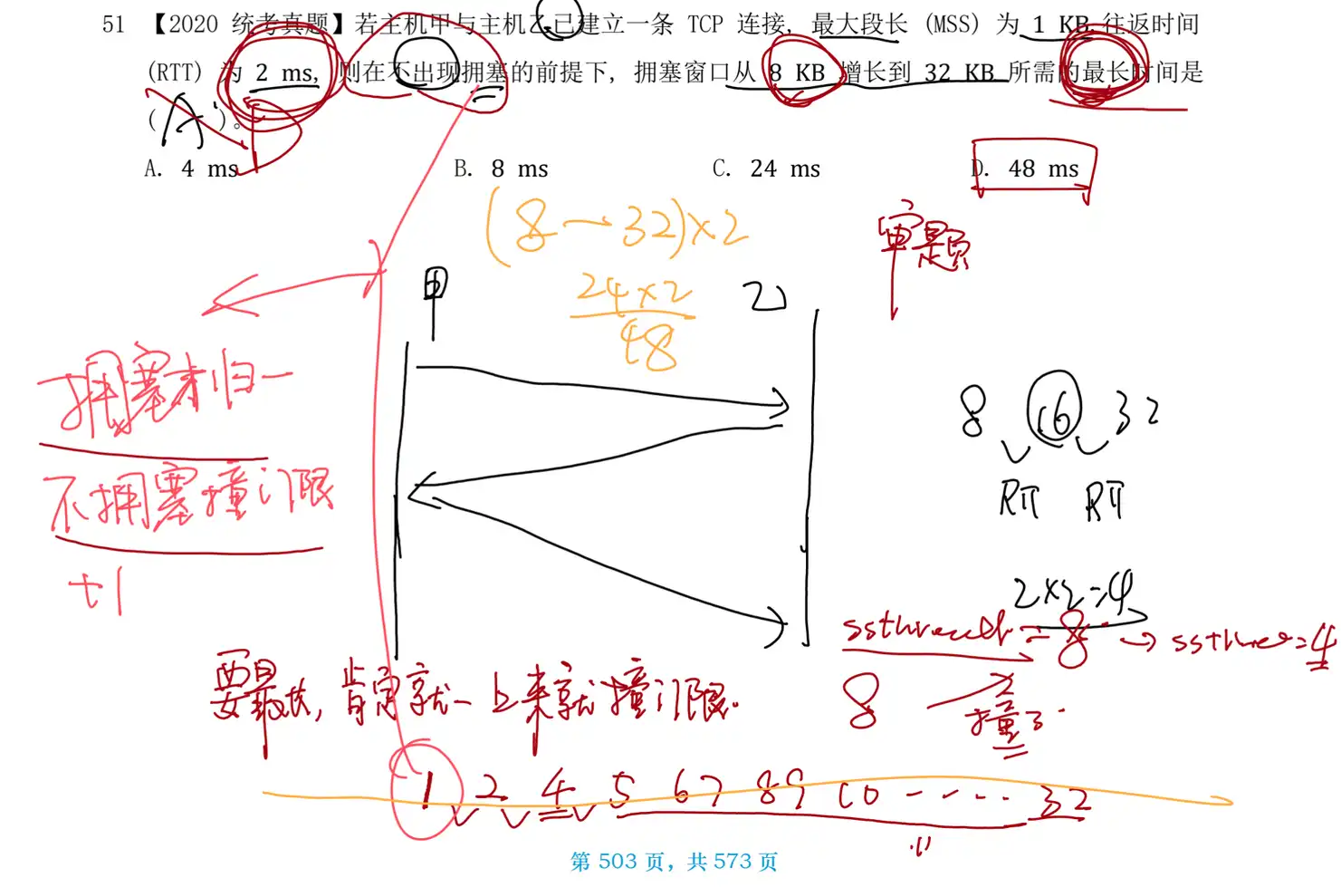 题51 题目 Q:【2020 统考真题】若主机甲与主机乙已建立一条 TCP 连接, 最大段长 (MSS) 为 ,往返时间(RTT)为 ,则在不出现拥塞的前提下,拥塞窗口从 增长到 所需的最长时间是( )。 A. B. C. D. 分析 A:注意审题的最长时间 解 选D