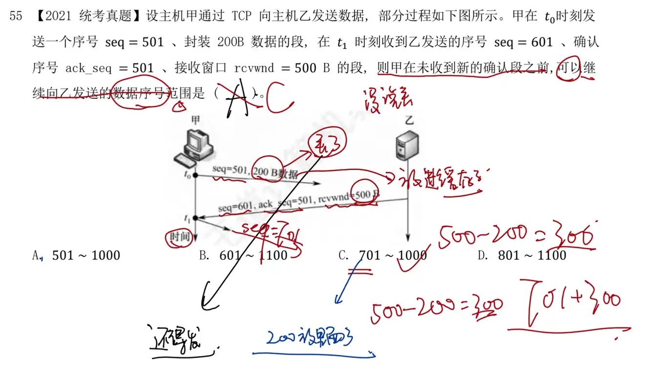 题55 题目 Q:【2021 统考真题】设主机甲通过 TCP 向主机乙发送数据,部分过程如下图所示。甲在 时刻发送一个序号 seq 、封装 数据的段,在 时刻收到乙发送的序号 seq 601 、确认序号 ack_seq 、接收窗口 rcvwnd 的段,则甲在未收到新的确认段之前, 可以继续向乙发送的数据序号范围是 ( )。 A. D. B. C. 分析 A:主机甲发送 数据的段后,继续发送数据的段的序号 seq 。因为甲收到乙发来的确认序号为 501、接收窗口为 500 的段,即从序号 501 开始,甲累积还能发送 500 B 的数据。因为甲此时已发送从序号 501 开始的 数据,所以甲在未收到新的确认段之前,还能发送的数据字节数为 ,还能发送的数据序号范围是 。 解 选C