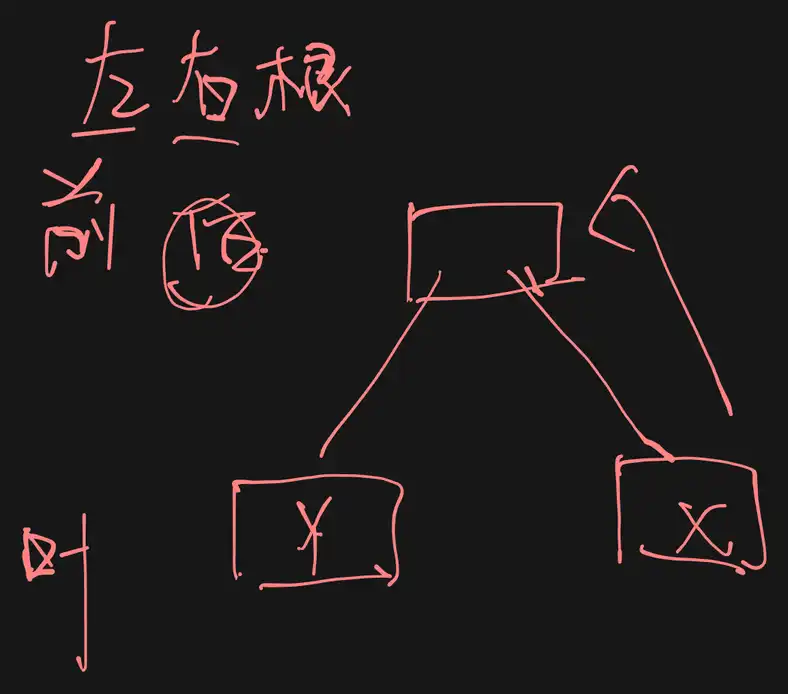 题37 题目 【2013 统考真题】若 是后序线索二又树中的叶结点,且 存在左兄弟结点 , 则 的右线索指向的是 ( ). A. 的父结点 B. 以 为根的子树的最左下结点 C. 的左兄弟结点 D. 以 为根的子树的最右下结点 分析 后续的访问顺序是左右根,有结点回退访问到根节点 解 A 根据后序线索二叉树的定义, 结点为叶结点且有左兄弟,因此这个结点为右孩子结点,利用后序遍历的方式可知 结点的后序后继是其父结点,即其右线索指向的是父结点。为了更加形象, 在解题的过程中可以画出如下所示的草图。