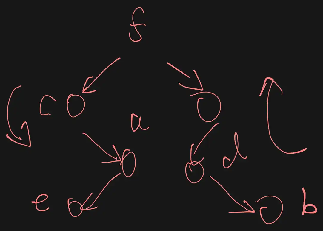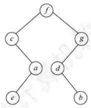 题40 题目 【2017 统考真题】已知一棵二叉树的树形如下图所示,其后序序列为 e, a, c, b, d, g, f,树中与结点 a 同层的结点是( )。 A. c B. d C. f D. g 分析 后序是左右根,后序是深搜 解 B 后序序列先访问左子树, 接着访问右子树, 最后访问父结点, 递归进行。根结点左子树的叶结点首先被访问,它是 。接下来是它的父结点 ,然后是 的父结点 。接着访问根结点的右子树。它的叶结点 首先被访问,然后是 的父结点 ,再后是 的父结点 ,最后是根结点 ,如下图所示。 因此 与 同层, 正确。