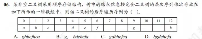 题6 题目 某非空二叉树采用顺序存储结构, 树中的结点信息按完全二叉树的层次序列依次存放 在如下所示的一维数组中, 则该二叉树的后序遍历序列为 ( ). 0123456789101112 A. ghbefhca B. gbdehcfa C. gdbhefca D. bgdehcfa 分析 根据题目可以建立二叉树,顺序结构存储一颗树,用的是层序遍历来存 解 C 在二叉树的数组存储结构中,下标为 的结点的左、右孩子的下标分别为 和 (若存在), 画出二叉树的形态如下图所示, 则后序遍历序列为 gdbhefca。