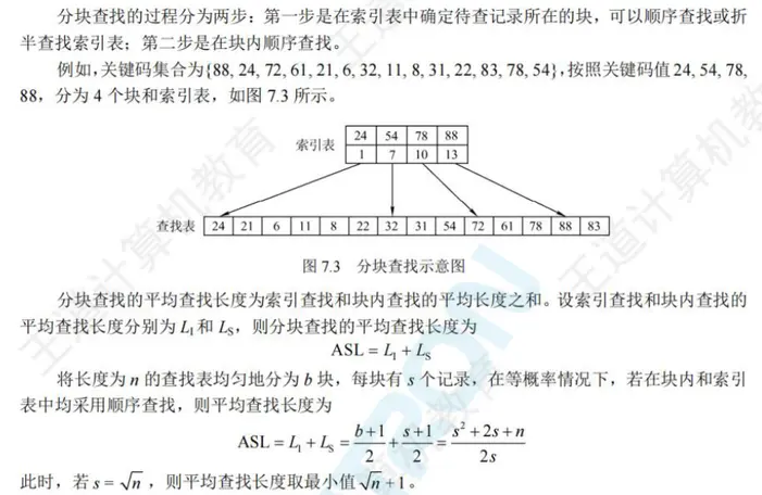 对于 A 块中的元素, 查找过程的第一步是先找到 A 块,由于是顺序查找,找到 A 块只需一步,然后在 A 块中顺序查找。