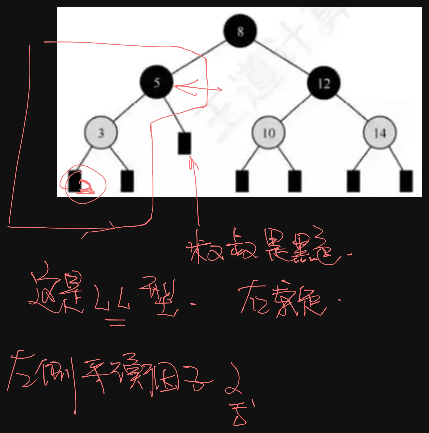 插入结点的叔叔是黑色,LL,RR,LR,RL旋转,然后变色