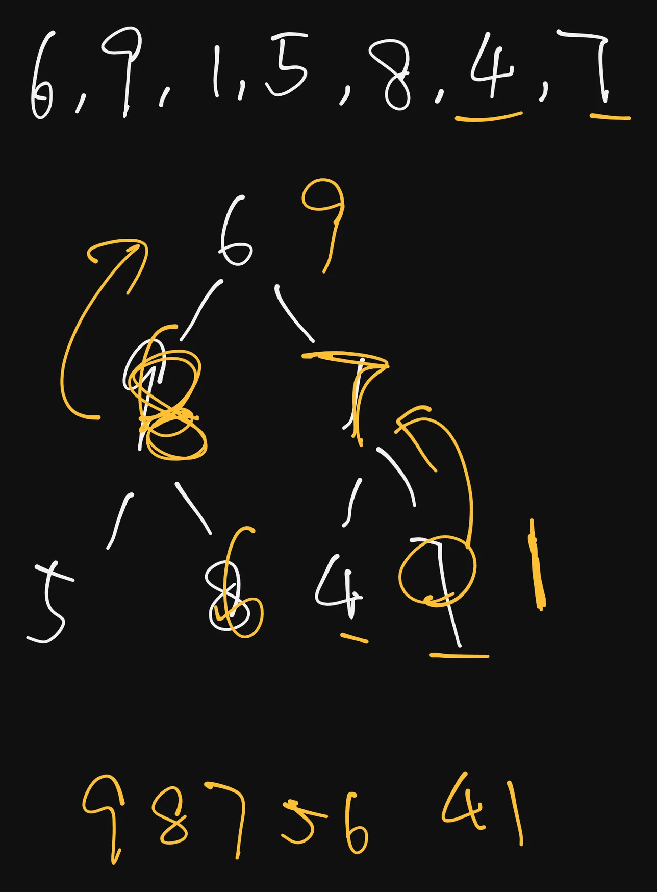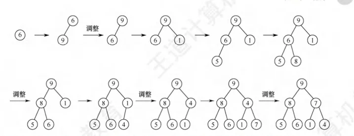 题20 题目 Q:【2021 统考真题】将关键字 6,9,1,5,8,4,7 依次插入初始为空的大根堆 ,得到的 是 ( ) . A. 9,8,7,6,5,4,1 B. C. D. 分析 A:要熟练掌握调整堆的方法, 建堆的过程如下图所示, 所以答案选择选项 B。 解 B 注意, 给定序列依次插入空堆的结果与给定序列直接调整成堆的结果是不同的, 最终得到的堆的形式也不同。若对序列 直接调整成堆,则会误选 项。
