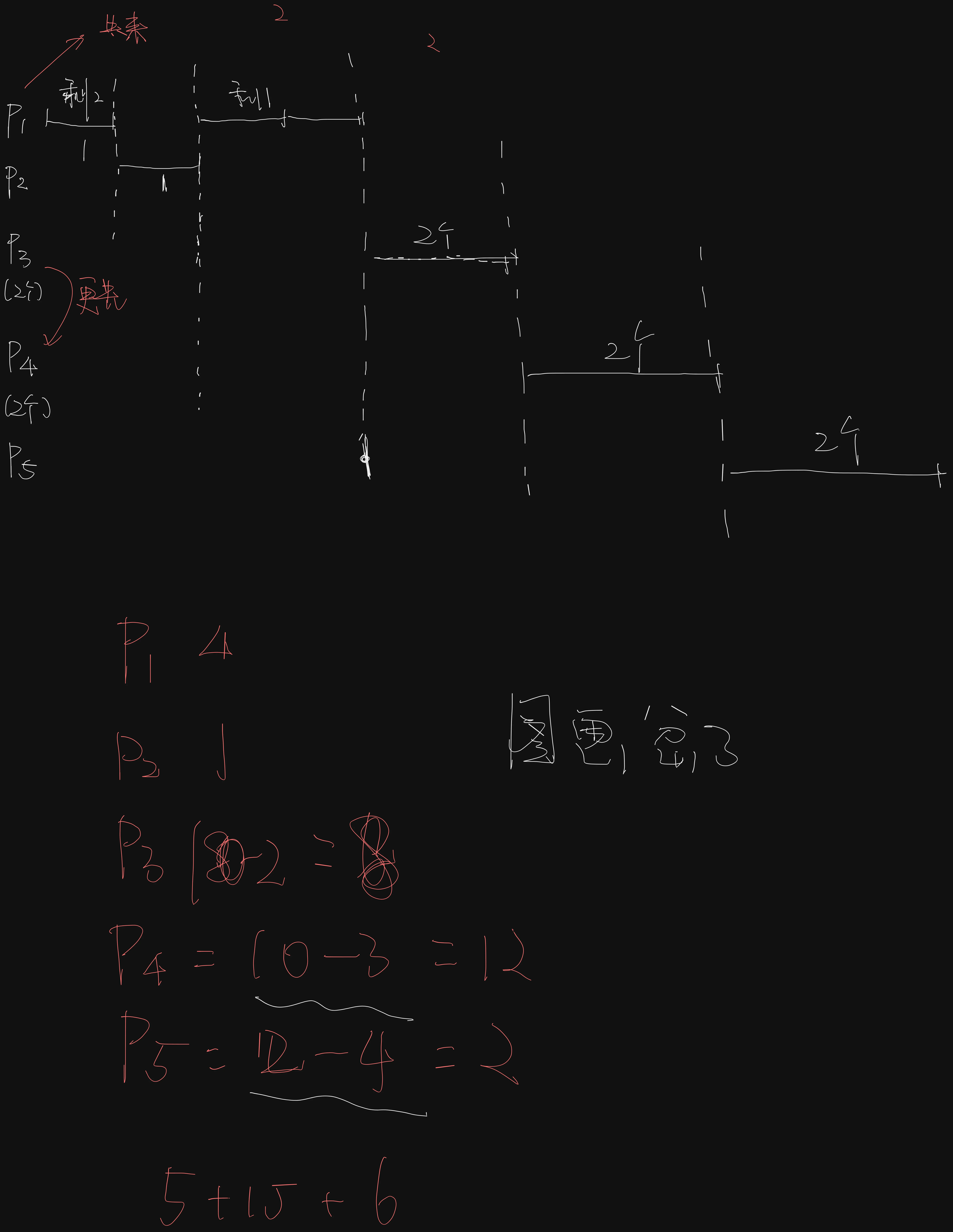 题27 题目 Q:使用抢占式最短剩余时间优先调度算法对下列进程进行调度, 总周转时间是 ( )。 A. B. C. D. 分析 A:最短剩余时间是指在进程执行过程中, 优先调度剩余时间最短的进程,这里的剩余时间是指进程还需要执行的时间。 也就是,谁来了以后,执行它的时间最短,就先执行它,如果有两个进程的剩余时间一样,那么就看谁先来。 解 C 根据各个进程的到达时间和预计运行时间, 画出甘特图如下。由此可知, 各个进程的周转时间分别为 、、、、 ,故总周转时间为 。