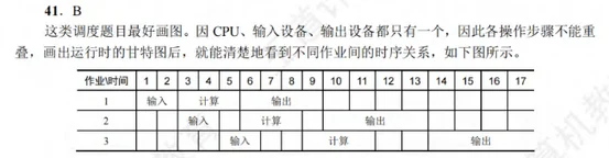 这类调度题目最好画图。因 CPU、输入设备、输出设备都只有一个, 因此各操作步骤不能重叠, 画出运行时的甘特图后, 就能清楚地看到不同作业间的时序关系, 如下图所示。