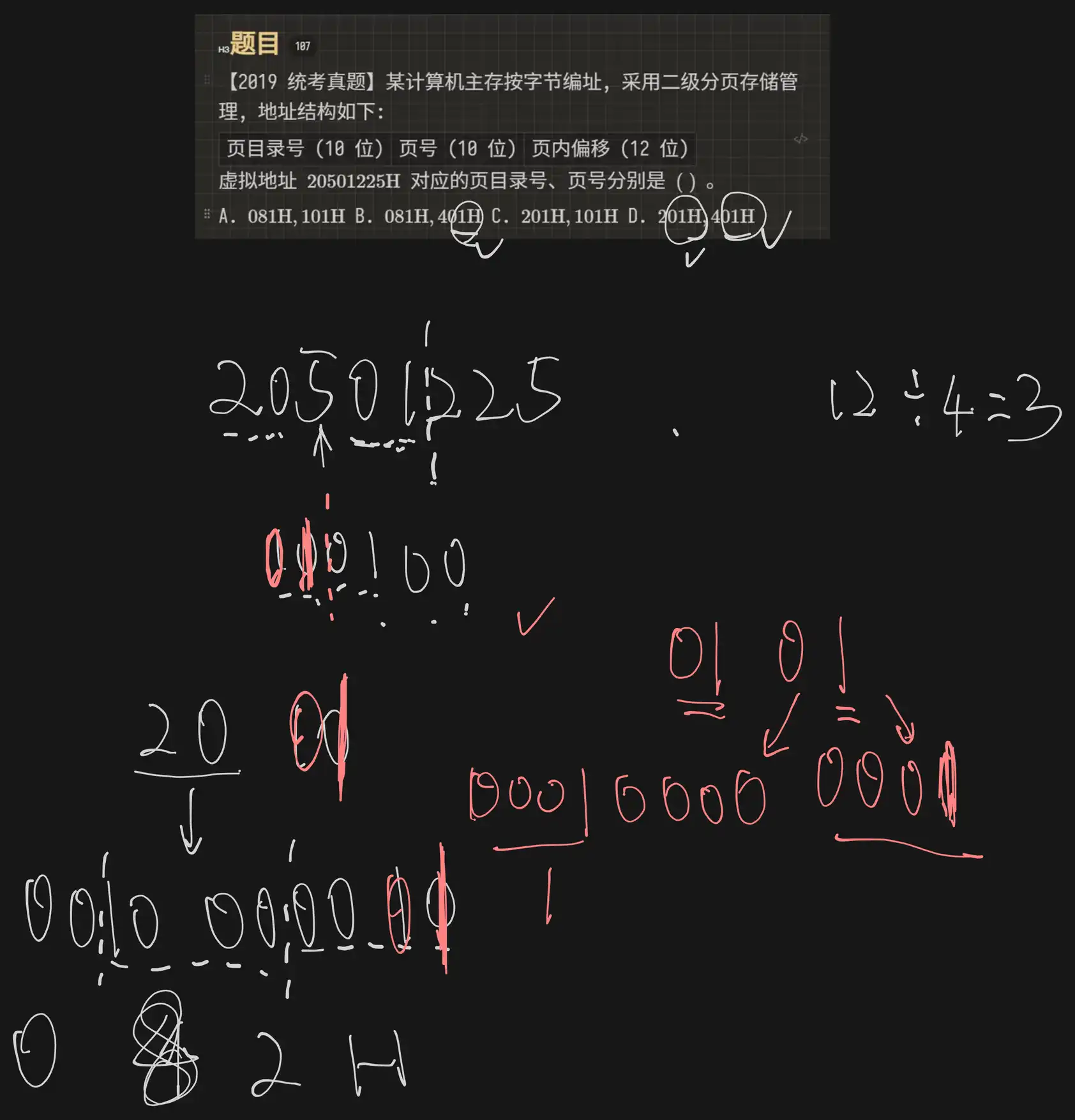 题中给出的是十六进制地址, 首先将它转化为二进制地址, 然后用二进制地址去匹配题中对应的地址结构。转换为二进制地址和地址结构的对应关系如下图所示。