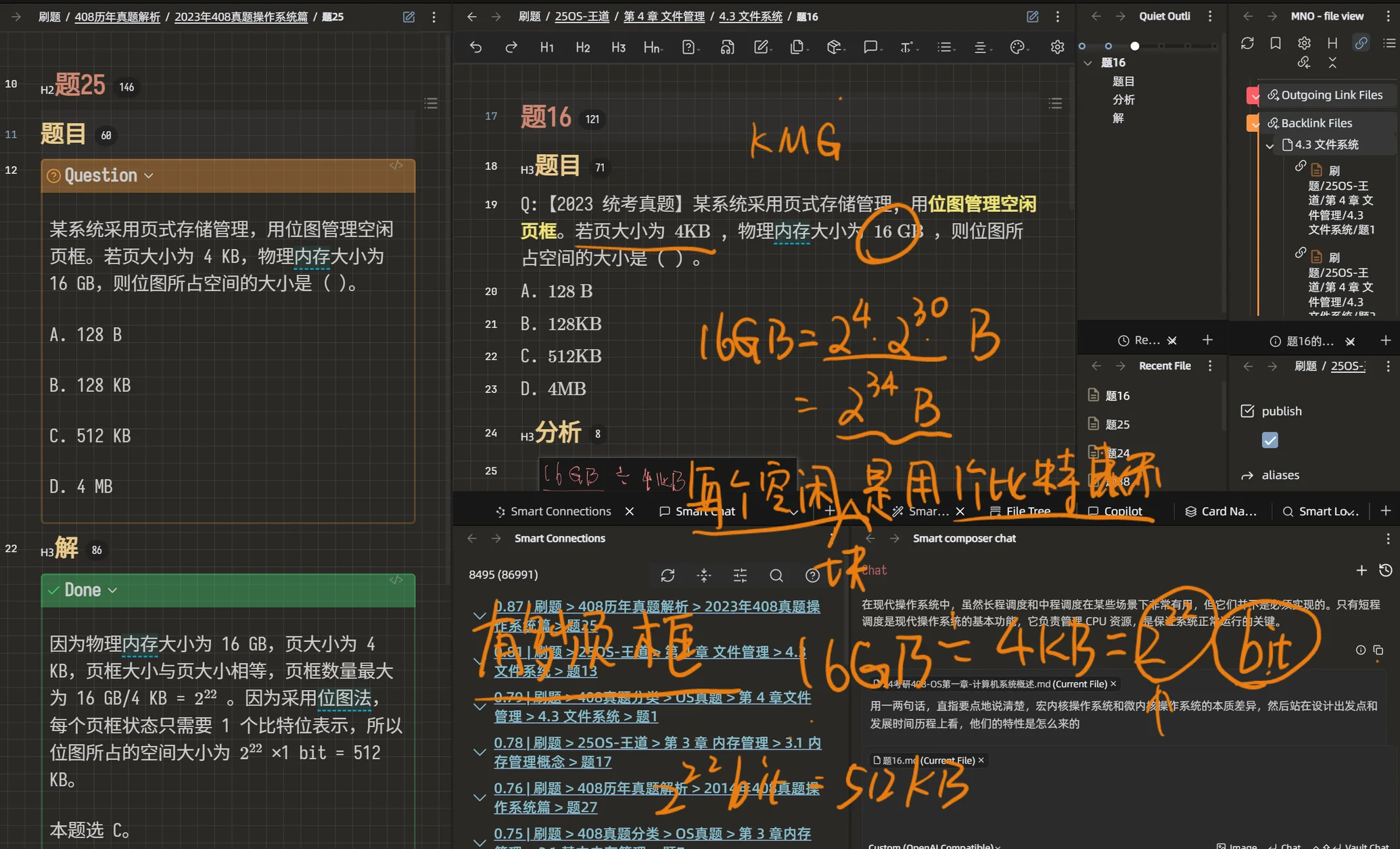 题16 题目 Q:【2023 统考真题】某系统采用页式存储管理, 用位图管理空闲页框。若页大小为 , 物理内存大小为 ,则位图所占空间的大小是 ( ) 。 A. B. C. D. 分析 A:我们和2014年的题目:题13对比一下,把位图的计算搞清楚 解 C 物理内存大小为 ,页大小为 ,则物理内存的总页框数为 。