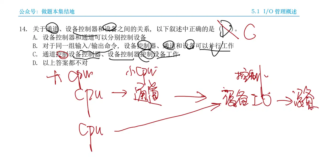 题14 题目 Q:关于通道、设备控制器和设备之间的关系,以下叙述中正确的是 ( )。 A. 设备控制器和通道可以分别控制设备 B. 对于同一组输入/输出命令, 设备控制器、通道和设备可以并行工作 C. 通道控制设备控制器、设备控制器控制设备工作 D. 以上答案都不对 分析 A:三者的控制关系是层层递进的,C正确。 对于同一组输入/输出命令,要么 CPU 给通道发出命令, 要么 CPU 直接给设备控制器发出命令, 不存在并行的可能, B 错误。 解 C