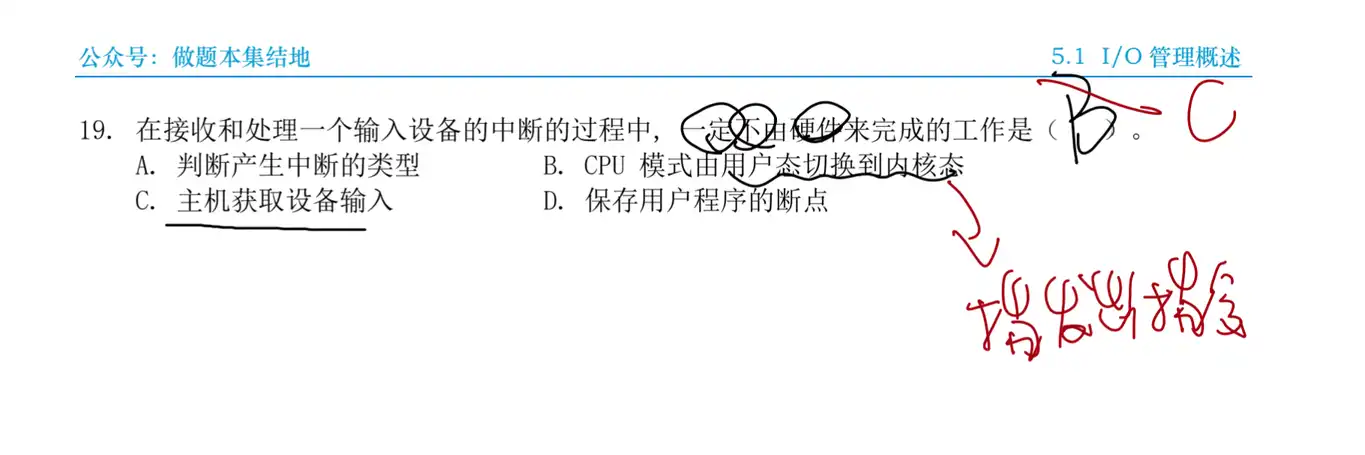 题19 题目 Q:在接收和处理一个输入设备的中断的过程中,一定不由硬件来完成的工作是( )。 A. 判断产生中断的类型 B. CPU 模式由用户态切换到内核态 C. 主机获取设备输入 D. 保存用户程序的断点 分析 A:在O 方式下, 由中断服务程序来完成数据的输入和输出, C 错误。 在中断响应阶段, 由硬件完成 CPU 模式的转换, 并保存用户程序的断点, 中断源的识别可以采用硬件识别法。 解 C