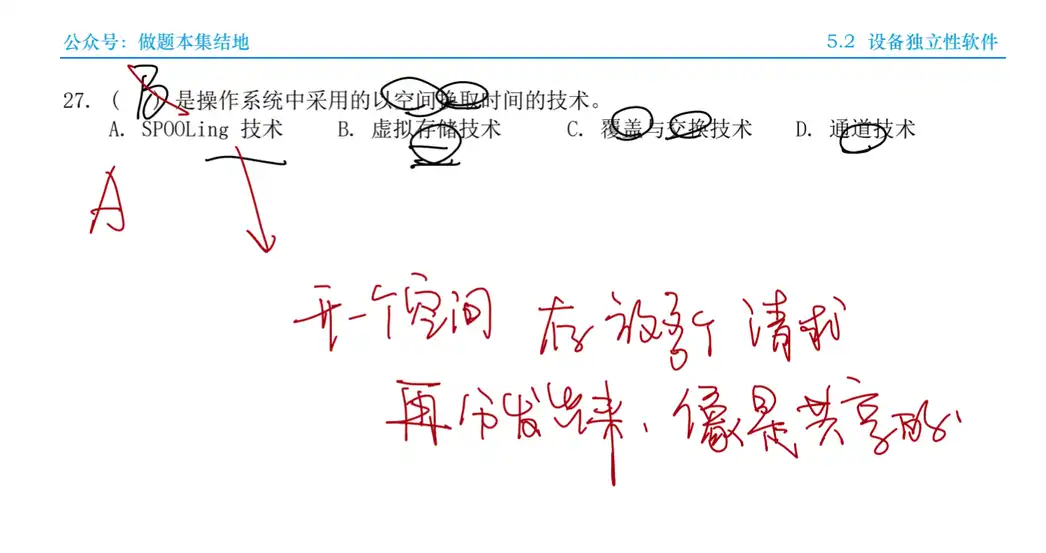 题27 题目 Q:( ) 是操作系统中采用的以空间换取时间的技术。 A. SPOOLing 技术 B. 虚拟存储技术 C. 覆盖与交换技术 D. 通道技术 分析 A:SPOOLing 技术需有高速大容量且可随机存取的外存支持, 通过预输入和缓输出来减少 CPU 等待慢速设备的时间, 将独享设备改造成共享设备。 解 A